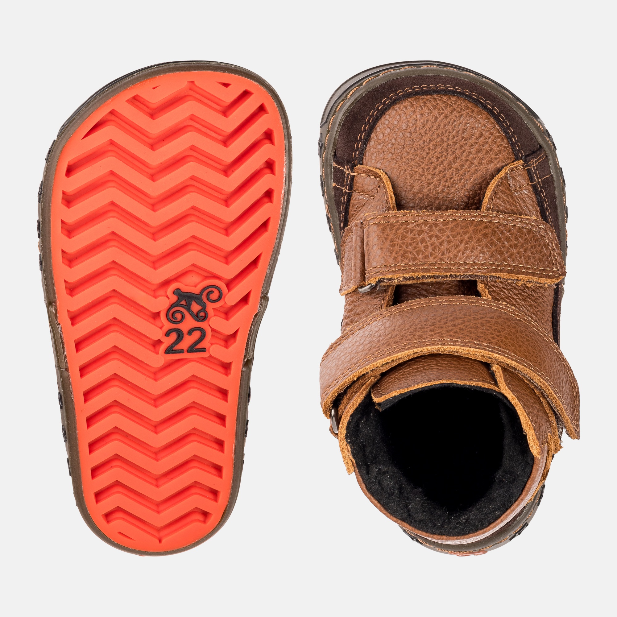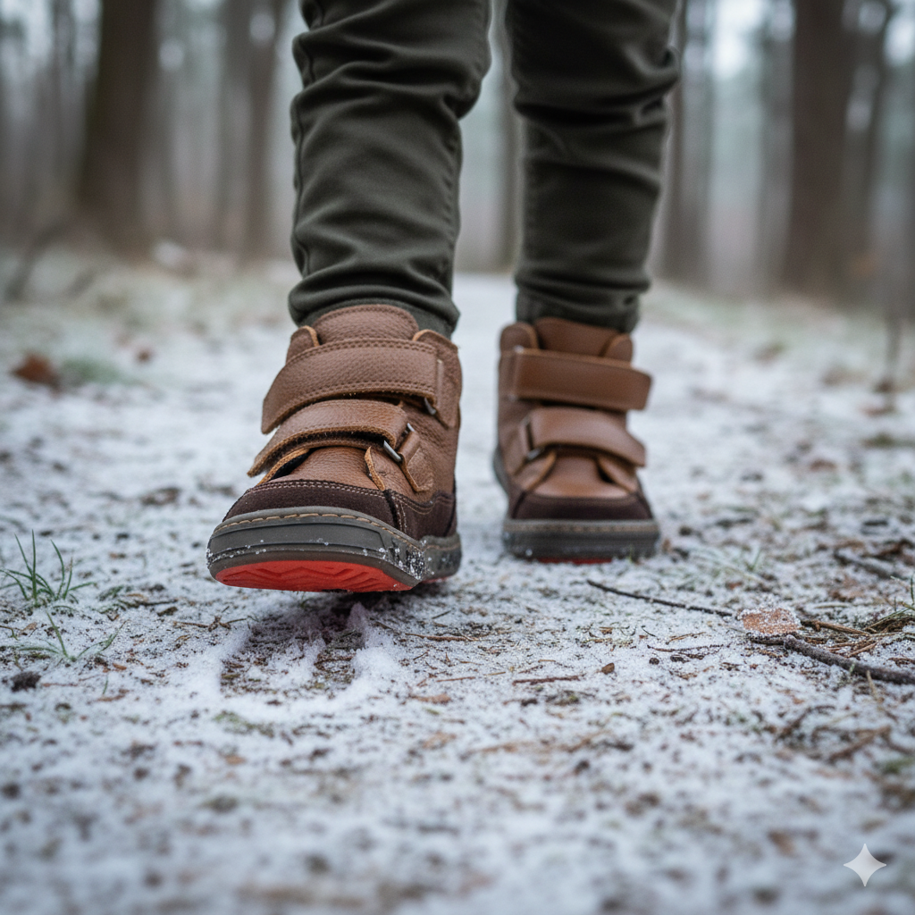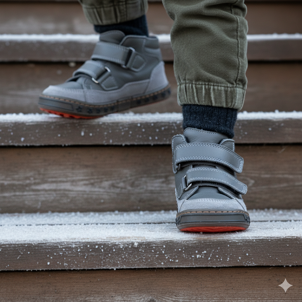 OLAF sind winterliche Kinder-Barfußschuhe aus Naturleder (Velours + Glatt) mit warmer Fütterung. Statt Schnürung/Reißverschluss gibt es zwei Klettverschlüsse – kinderleicht alleine. Barfuß-Konstruktion — breit im Zehenbereich, komplett flach, sehr flexibel — unterstützt die natürliche Fußentwicklung. Der Schutzrand bewahrt den Schaft vor Abrieb; das Profil hilft bei der Selbstreinigung von Matsch/Schnee. Perfekt für jeden Tag — von der Kita bis zum ersten Schnee.
