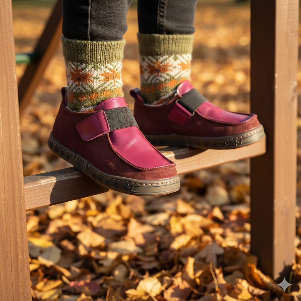 ZUBA sind Kinder-Barfußschuhe für Herbst und Frühling, die Velours und Glattleder mit Filzfutter kombinieren — perfekt für kühle Parkmorgen und den Weg in die Kita. Breite Zehenbox, Zero-Drop und sehr flexible Sohle fördern die natürliche Fußentwicklung, der Klett sorgt für schnellen, sicheren Sitz. Klassisches, modisches Design in mehreren Farben — Übergangs-Barfußschuhe für stilbewusste Eltern.