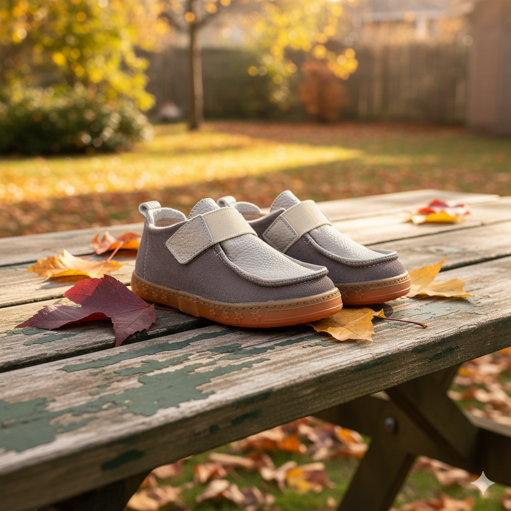 Flach, breit und weich — die Füße lernen Balance ohne harte Stützen, während die klare Silhouette jedes Herbst- oder Frühlings-Outfit modern hält.