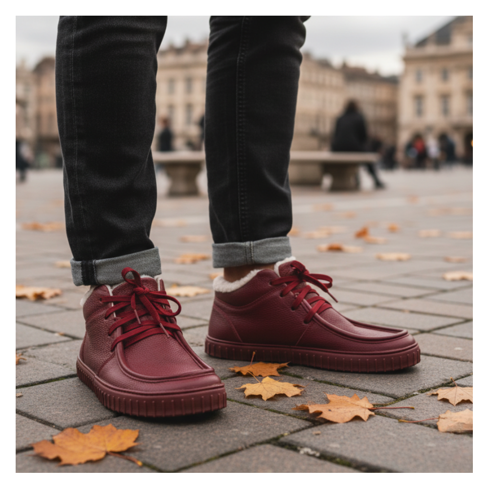 Matte suede gives a soft, autumn-winter vibe; smooth leather raises the formality for meetings, while fabric versions visually refresh the whole look. The common denominator? The moc-toe refines the front and adds class, while the urban sole brings energy and lightness. At the same time, they remain true barefoot winter shoes: zero-drop, wide toe box, and flexible construction ensure a natural step. In the end, it’s "just" a design that looks great without losing the anatomy and functionality of a true barefoot shoe.