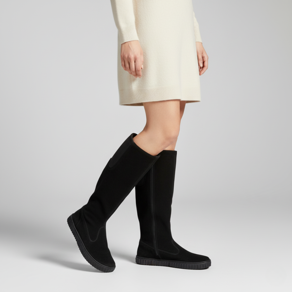 Knee-high barefoot boots are a strong base for winter styling. Paired with a wool coat, they create a clean, elegant look; with a midi dress and thick tights, they add lightness; with an oversized sweater and leggings, they bring a modern, sleek touch. The slim upper balances proportions and visually elongates the legs, while the minimalist design complements rather than competes with the rest of your outfit. These are women’s winter barefoot boots that easily match a variety of looks — from office to weekend — and blend seamlessly with other pairs in your rotation.