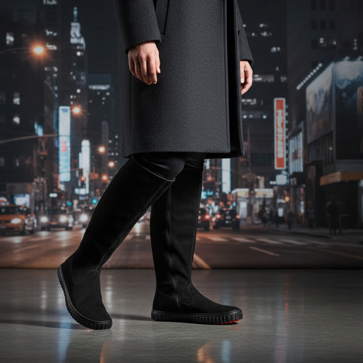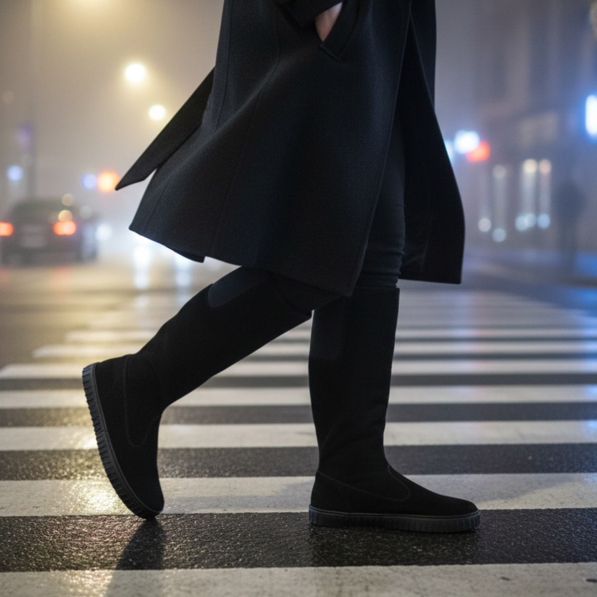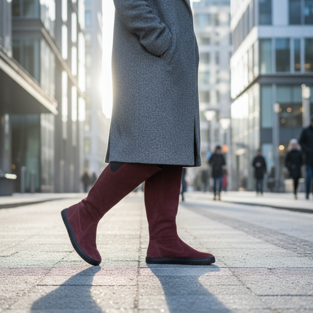 Knee-high barefoot boots are a strong base for winter styling. Paired with a wool coat, they create a clean, elegant look; with a midi dress and thick tights, they add lightness; with an oversized sweater and leggings, they bring a modern, sleek touch. The slim upper balances proportions and visually elongates the legs, while the minimalist design complements rather than competes with the rest of your outfit. These are women’s winter barefoot boots that easily match a variety of looks — from office to weekend — and blend seamlessly with other pairs in your rotation.