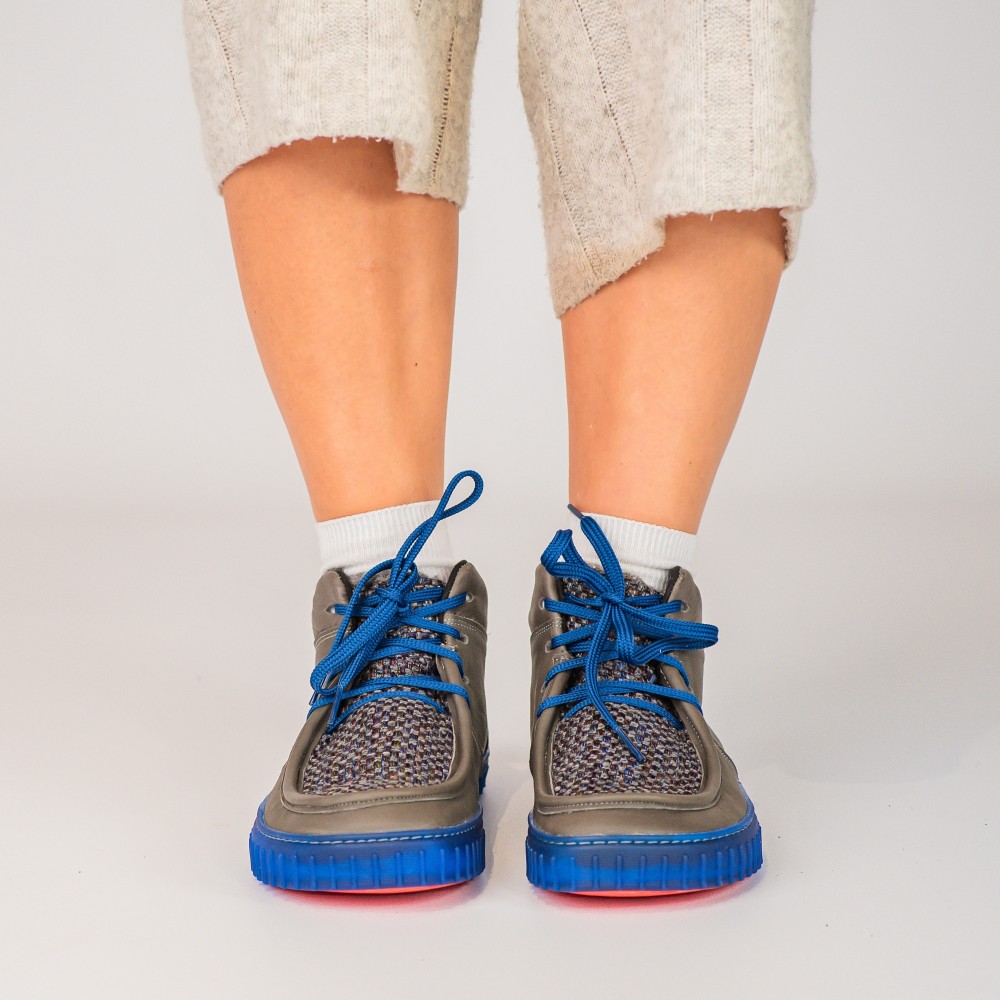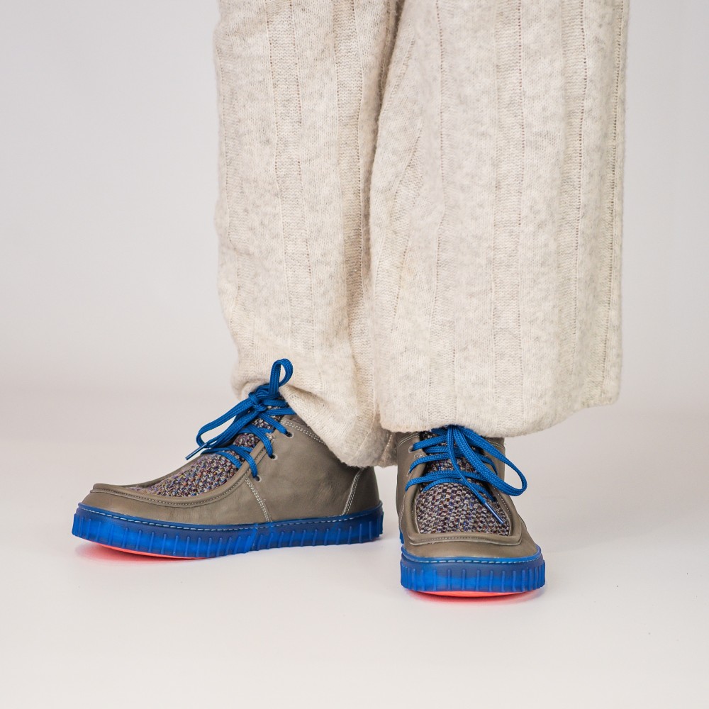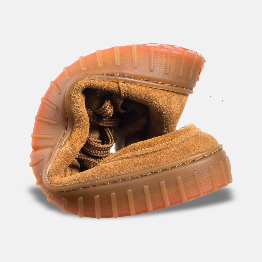 Gamuza, cuero liso o una mezcla con tejido noble. En el interior, un forro de lana que proporciona calor y comodidad en los días fríos, sin restricciones innecesarias. También se ve genial con calcetines gruesos de lana que sobresalen por encima del empeine.